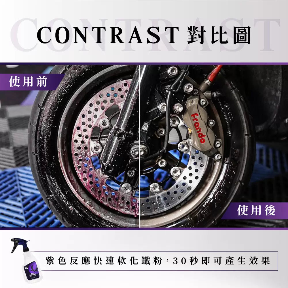 - Iron Fallout Remover: Neutral formula safe for the whole vehicle; effectively breaks down iron particles, brake dust, and industrial fallout.