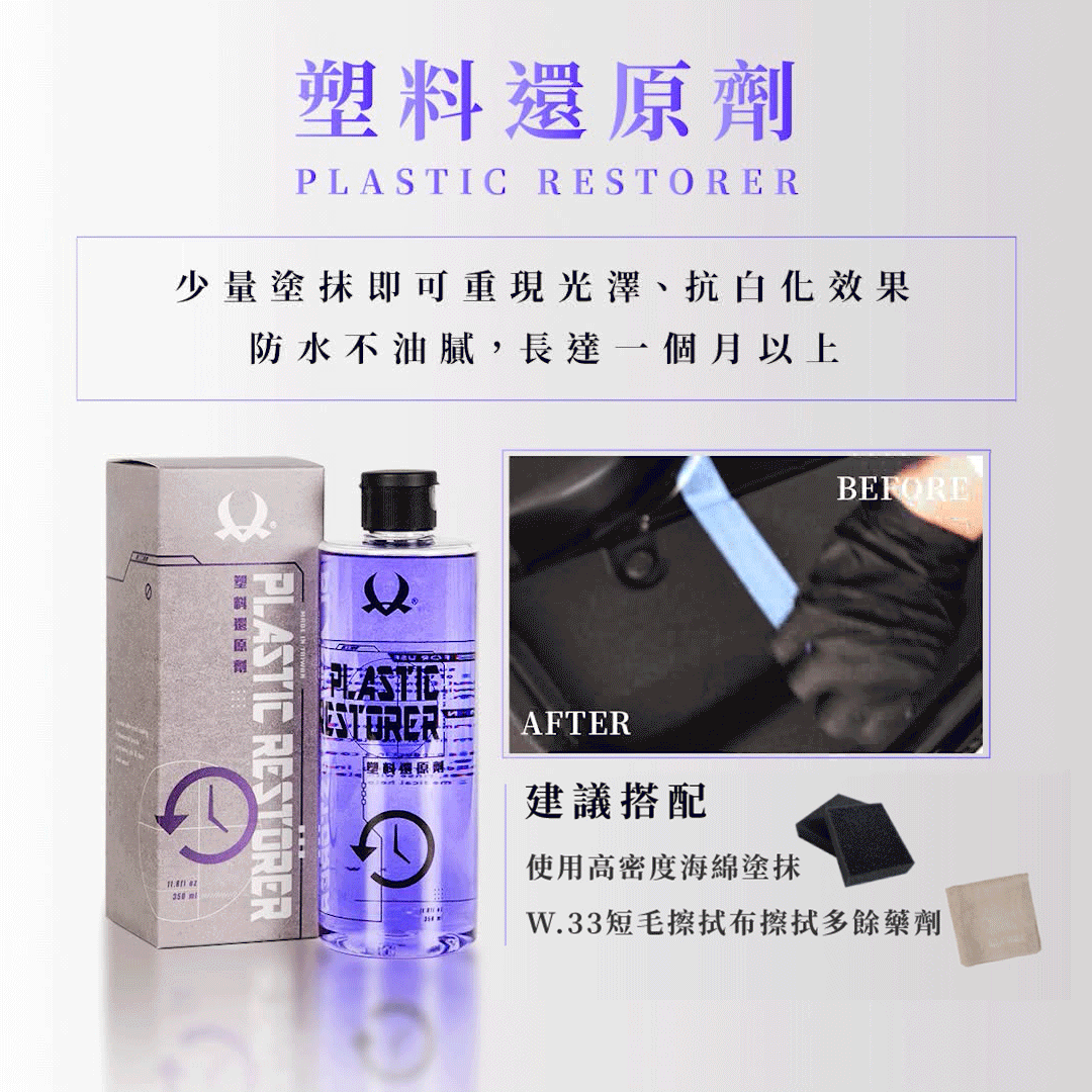 - High-spread Plastic Restorer; a small amount enhances gloss, prevents whitening, and creates a water-repellent protective film lasting up to one month.