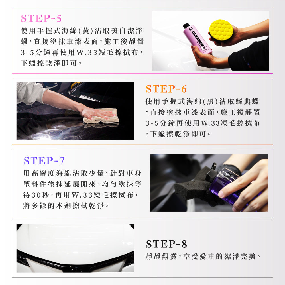 - Using the handheld applicator (Yellow), apply Brightening Clean Wax directly to the paint; after about 3–5 minutes, remove with the W.33 short-pile cloth.